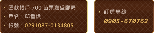 匯款完成後請來電或來信告知匯款帳號末五碼、訂房日期、訂房人姓名以便進行確認,確認無誤後,本民宿將為您保留房間,恭候您的蒞臨。